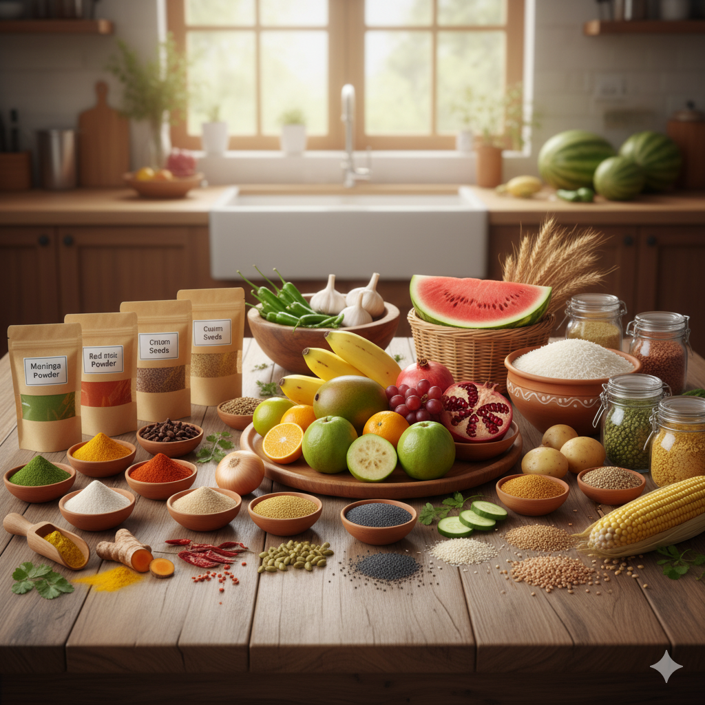 We carefully source our products from trusted farmers and processors, ensuring each item is naturally grown, hygienically processed, and packed with care. From nutrient-rich moringa and turmeric powders to fresh, juicy mangoes, bananas, and pomegranates, and from flavorful cardamom, cumin, and cloves to essential pulses and cereals, our offerings reflect the best of Indian agriculture.